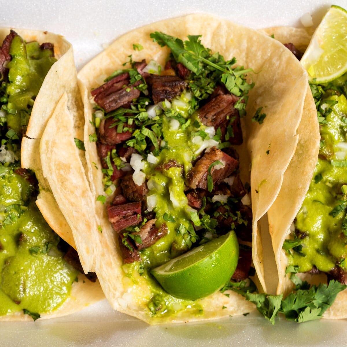 Three warm flour tortillas with grilled steak, topped with saute?ed bell peppers grilled onions, and a dash of fresh chopped cilantro, onions, and Creamy Avocado Salsa.