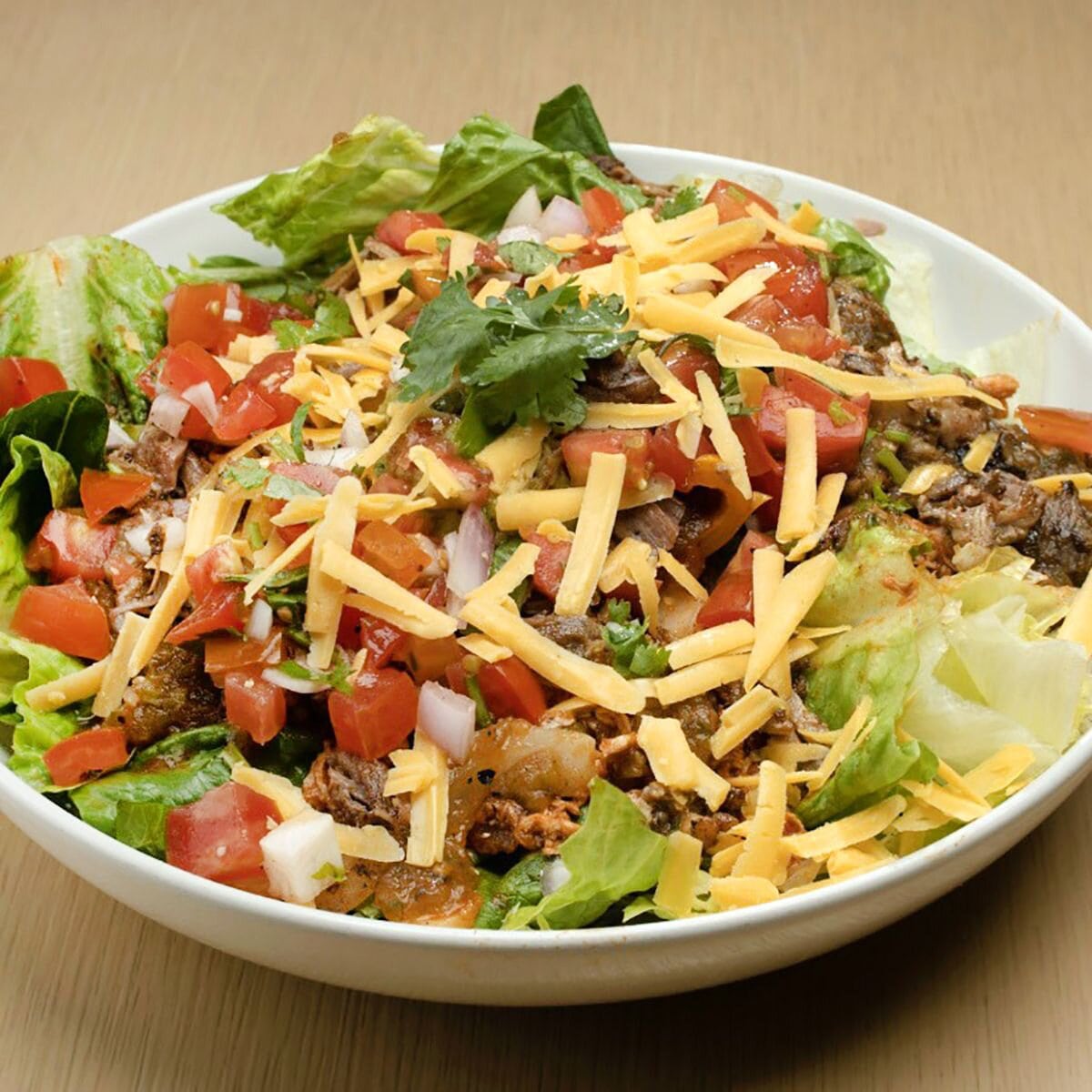 Romaine lettuce, carnitas ( pork ) roasted red salsa, cheddar cheese and guacamole. Served with Keto Ranch dressing on the side.