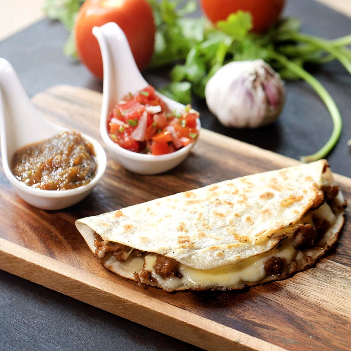 Seasoned plant based Beyond Meat with fresh diced tomato in a six inch tortilla folded and grilled with SWEEST organic soy-based artisan cheddar cheese . Served with Sunrise salsa